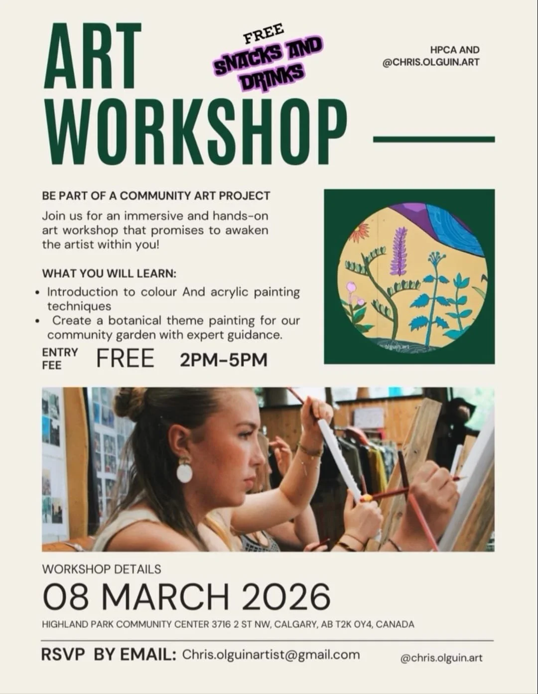 Led by artist Chris Olguin, this workshop will guide participants through the basics of colour and acrylic painting techniques while creating botanical themed artwork inspired by nature.