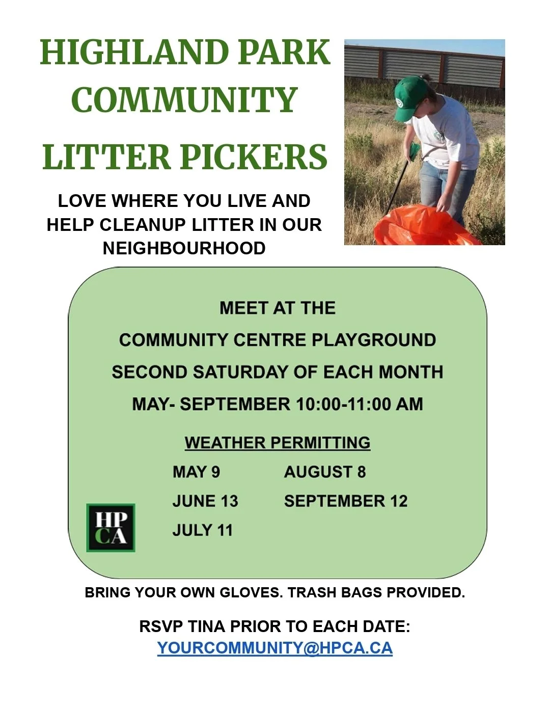 Meet at the Highland Park Community Centre playground at 10:00 am (weather permitting). Trash bags are supplied. Remember to bring your own gloves and grabbing tools due to limited supplies.